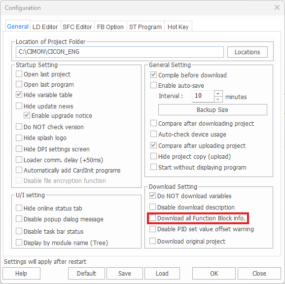 - Under the General tab, check Download all Function Block info.