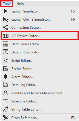 - On the menu bar, left-click Tools and left-click I/O Device Editor*.