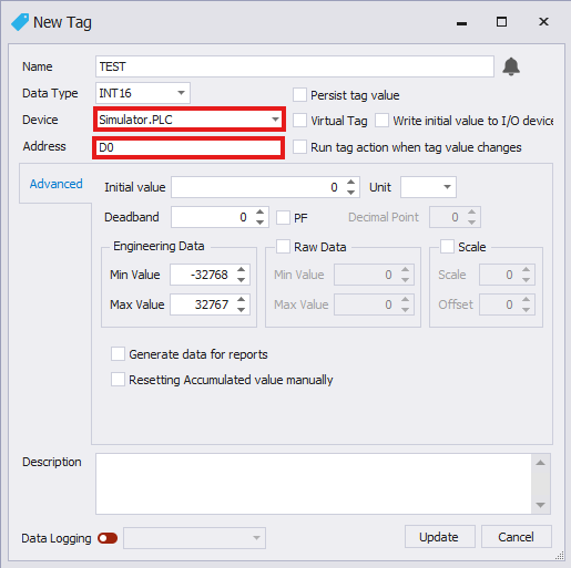 - For the Device parameter, add the new I/O device and station. For Address, add the data register address to target. Left-click Update when finished.