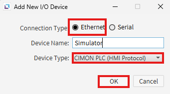 - Ensure Ethernet is selected for the Connection Type. For Device Type, use CIMON PLC (HMI Protocol).