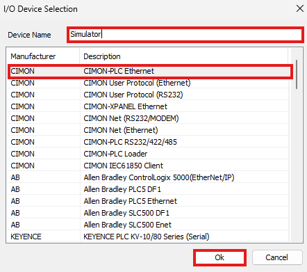 - Name the device, select CIMON-PLC Ethernet, and left-click Ok.