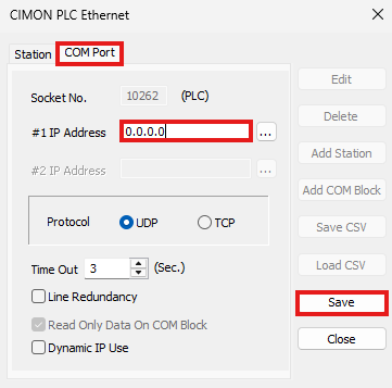 - Left-click COM Port, set the #1 IP Address to 0.0.0.0, and left-click Save.
