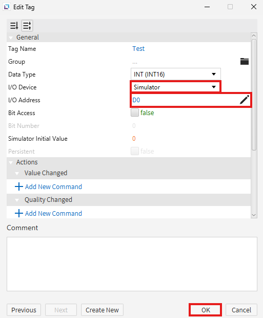 - Change the I/O Device Type to the I/O device created in step 2 and 3. Set the I/O Address to the data register to read/write. Left-click OK.