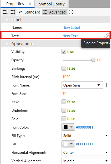 - In the Label object Properties, next to Text, left-click the Binding Properties (chain-link) icon.