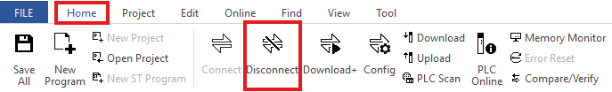 - To add modules to the CICON Simulator, disconnect from the simulated PLC. On the menu bar, left-click Home and left-click Disconnect.