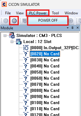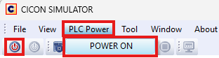 - On the CICON Simulator menu bar, left-click PLC Power and left-click POWER OFF. Optionally, on the toolbar, left-click the PLC OFF icon.