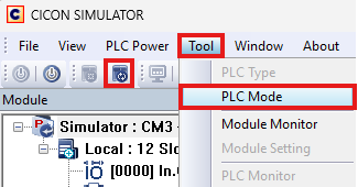 - On the CICON Simulator menu bar, left-click Tool and left-click PLC Mode. Optionally, on the toolbar, left-click the PLC Mode icon.