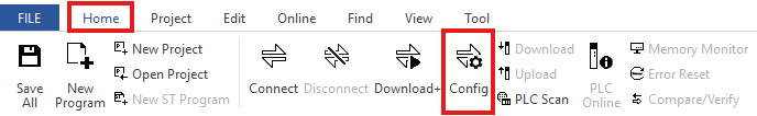 - On the menu bar, left-click Home and left-click Config.