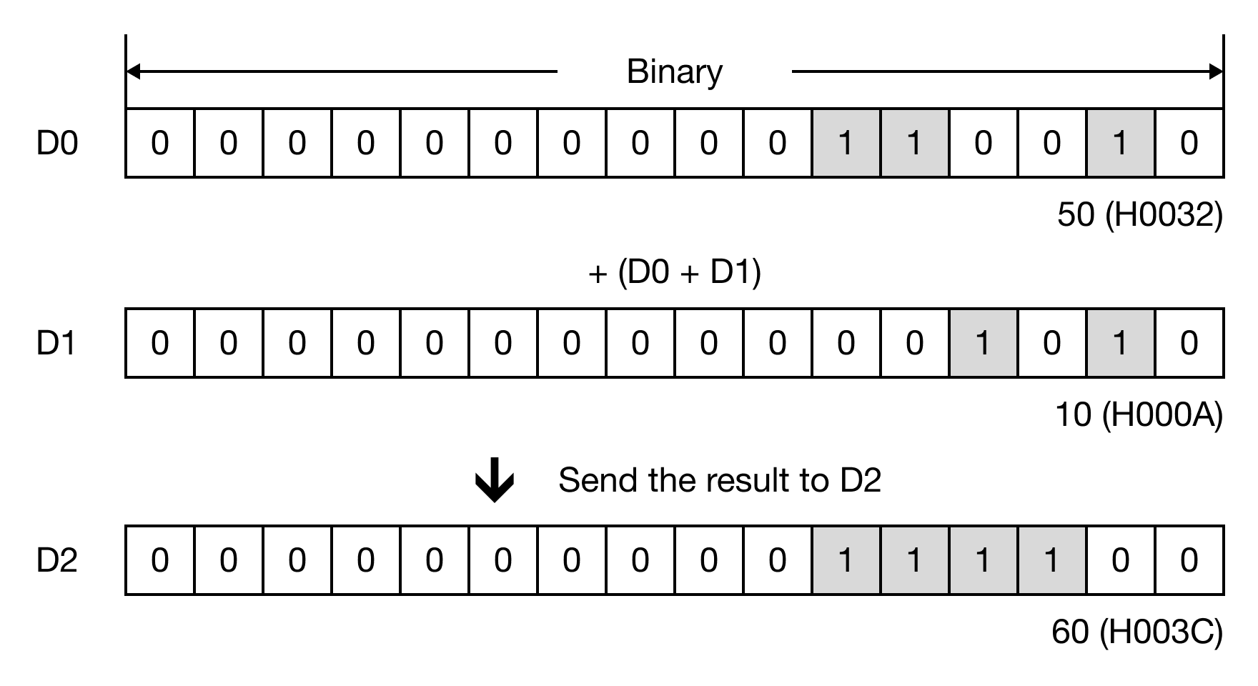 When the contact, M0.0, is powered ON, the WORD data register, D0, is added to the WORD data register, D1, and the sum saved in the WORD data register, D2.