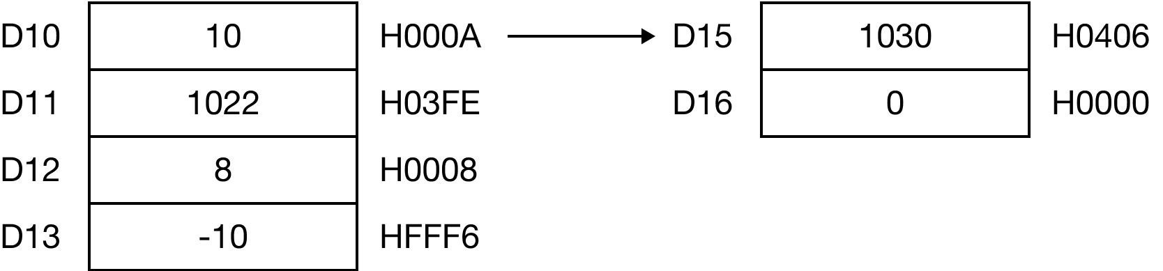 When M0.0 is powered ON, the WORD data registers, D10, D11, D12, and D13, are added together, and the sum is saved in the WORD data register, D15.