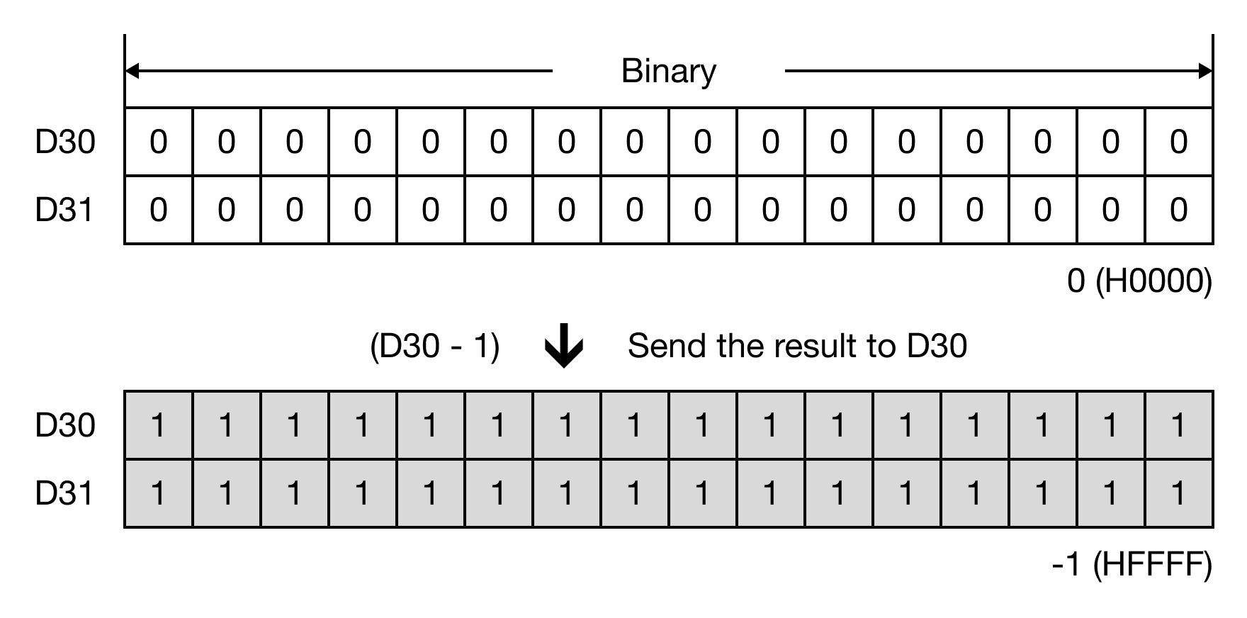 When the contact, M0.5, is powered ON, the value of the WORD data register, D30, decrements by 1 every scan.