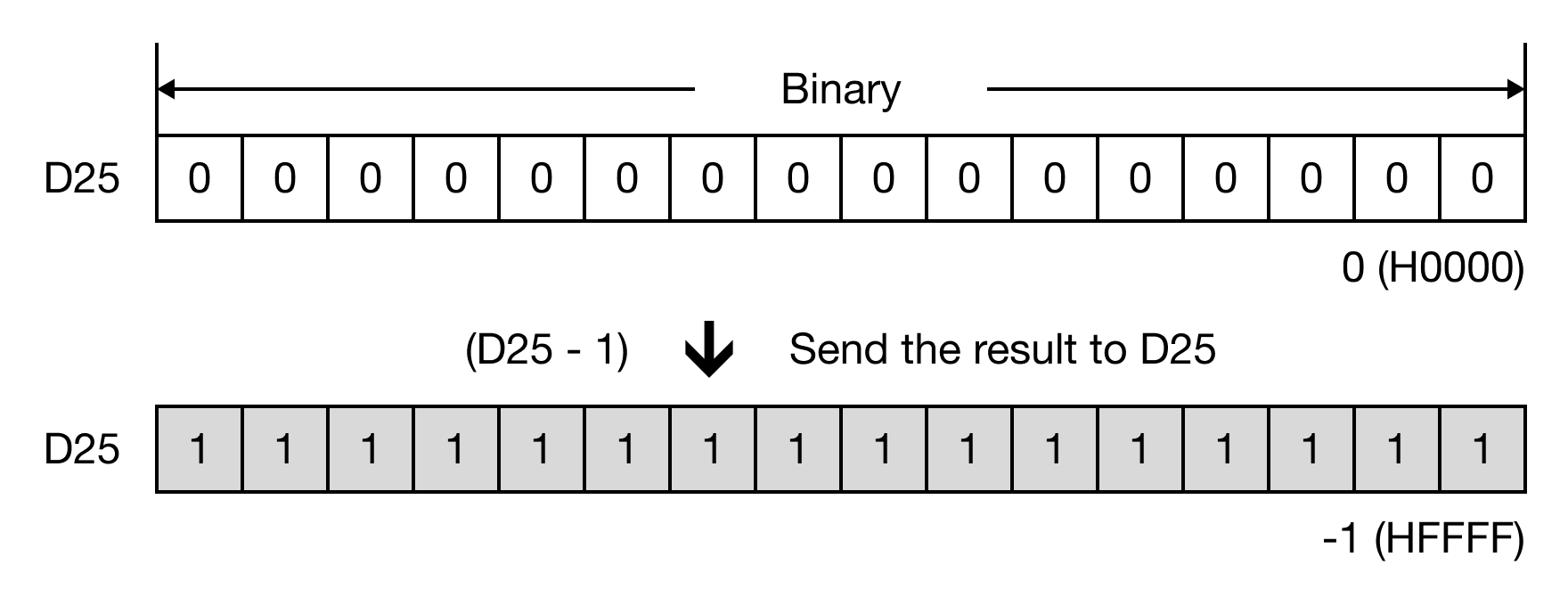 When the contact, M0.5, is powered ON, the value of the WORD data register, D25, decrements by 1 every scan.