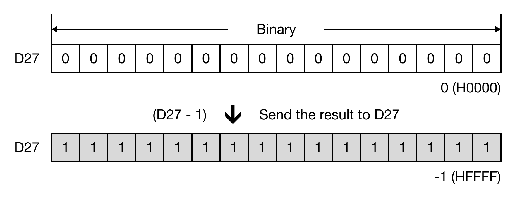 When the contact, M0.5, is powered ON, the value of the WORD data register, D27, decrements by 1 every scan.