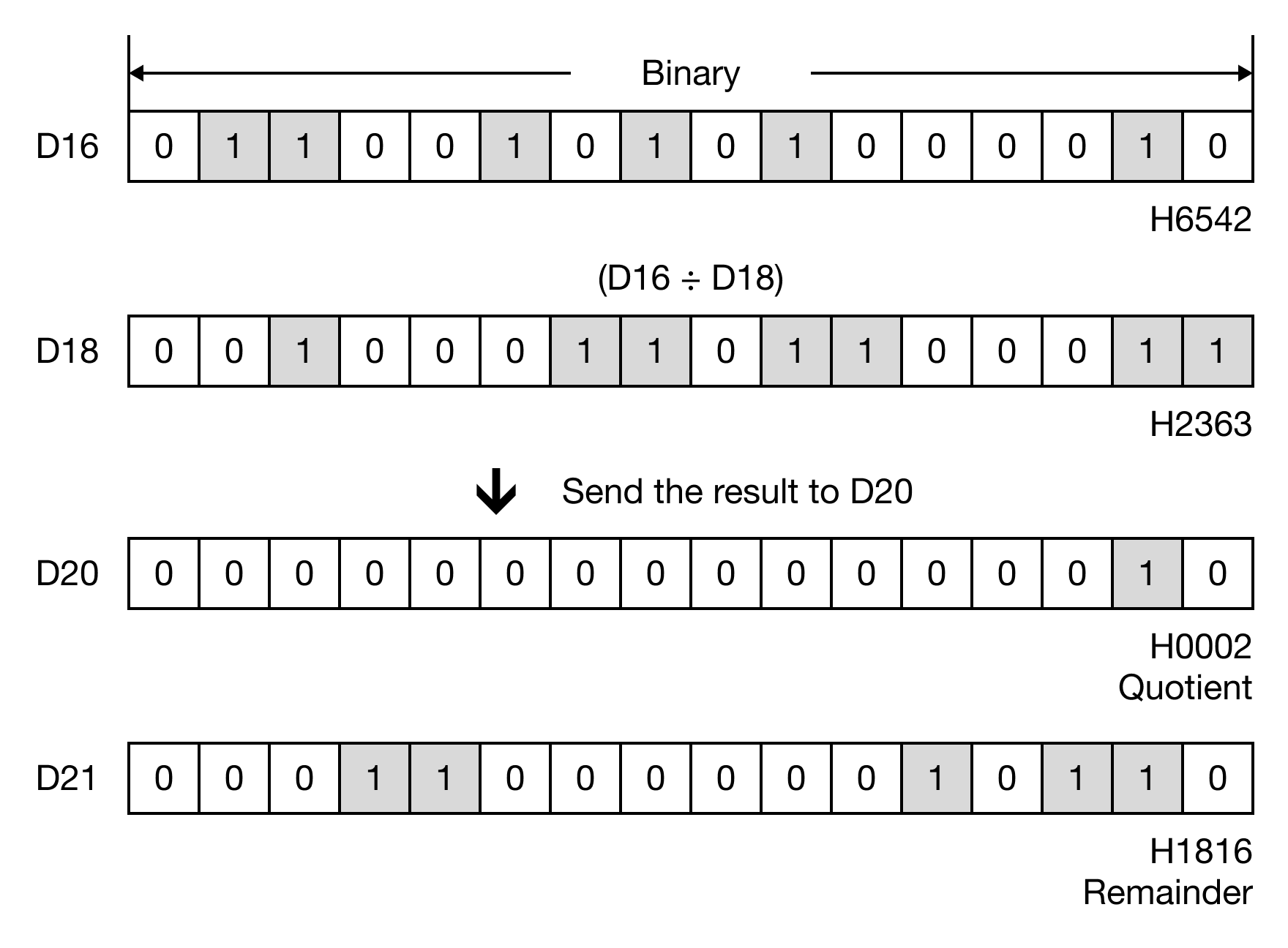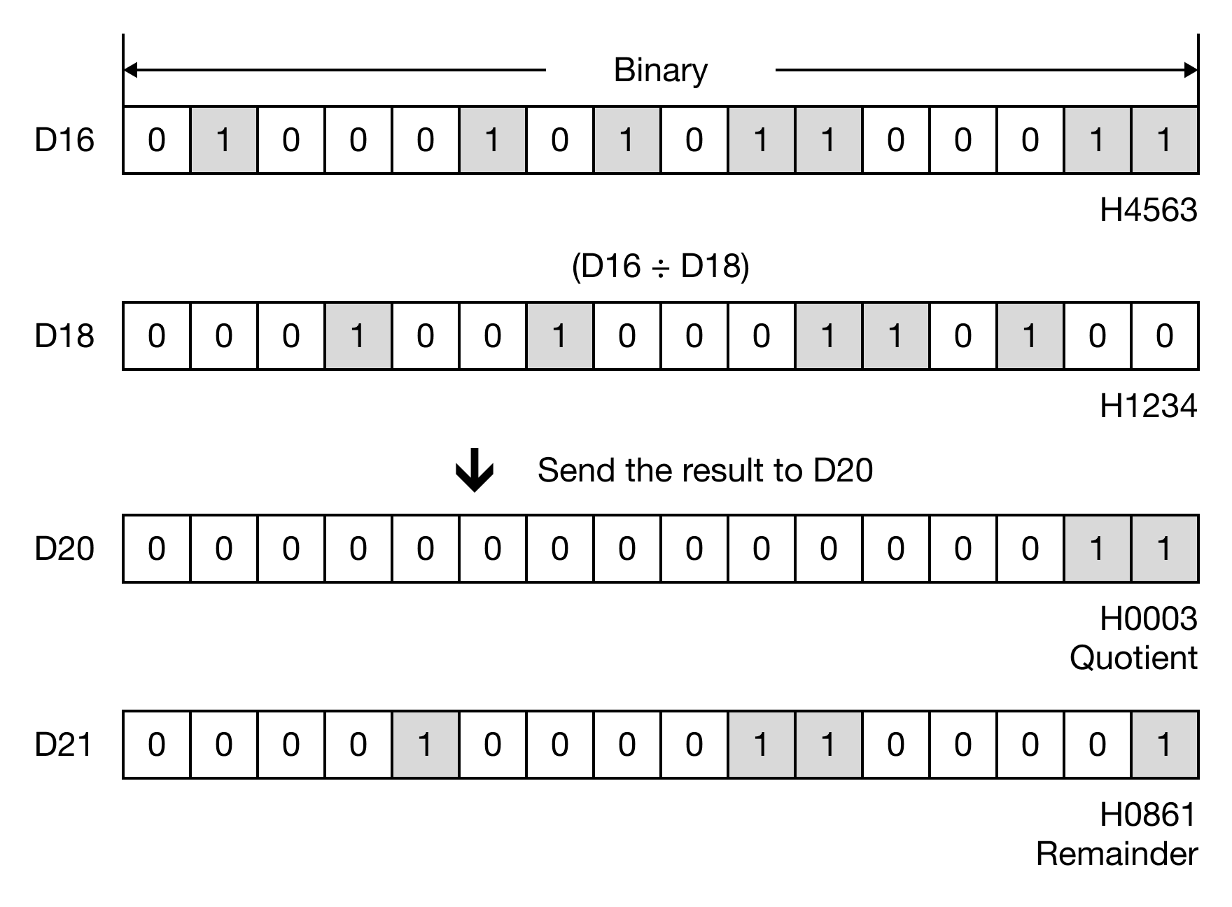When the contact, M0.0, is powered ON, the 4-digit binary-coded decimal data register, D16, is divided by the 4-digit binary-coded decimal data register, D18, and the result is saved in the 8-digit binary-coded decimal data register, D20.