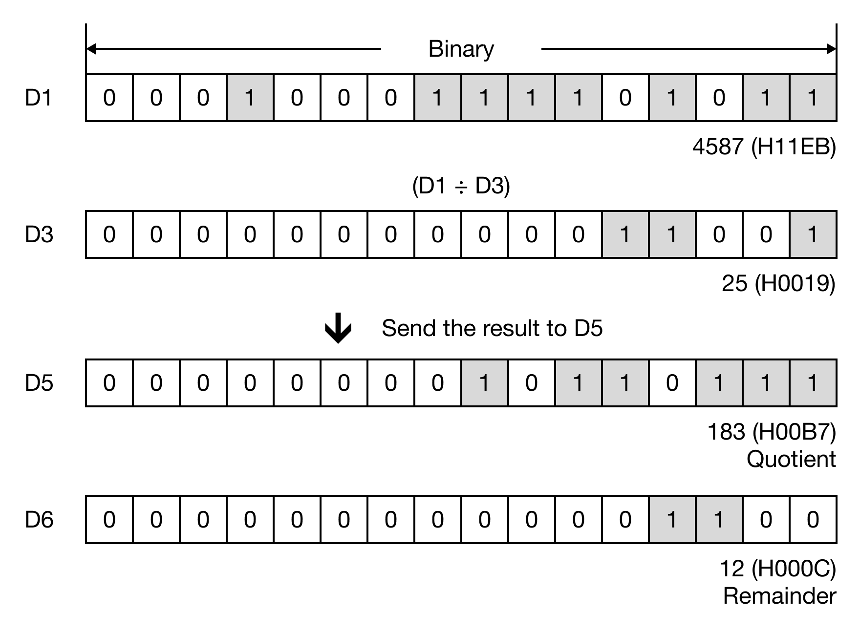 When the contact, M0.0, is powered ON, the WORD data register, D1, is divided by the WORD data register, D3, and the result saved in the DWORD data register, D5.