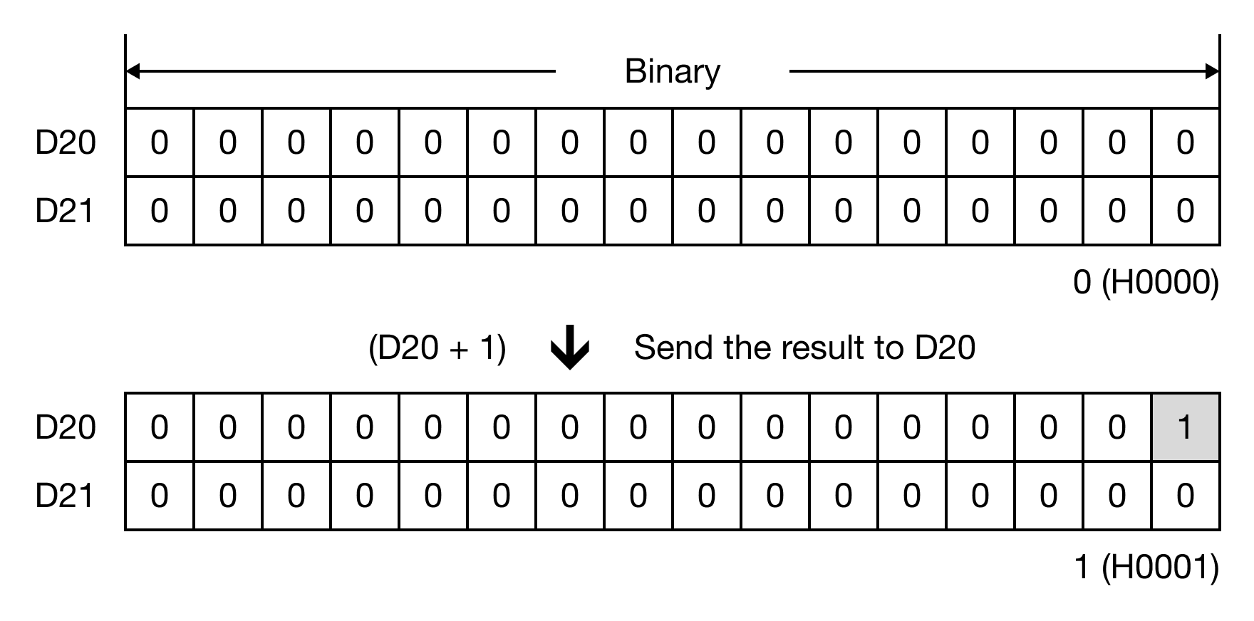When contact, M0.5, is powered ON, the value of the DWORD data register, D20, increments by 1 every scan.