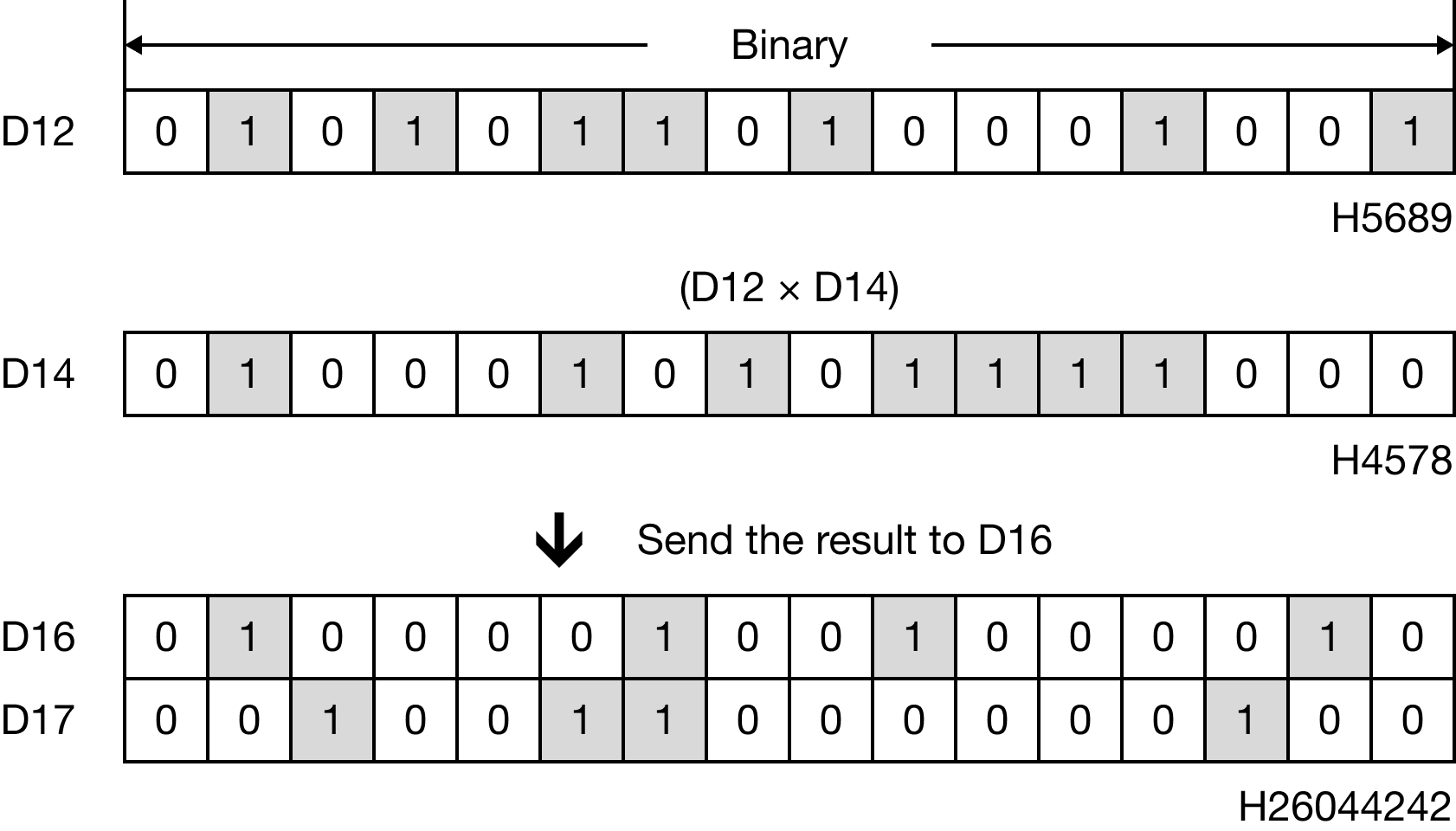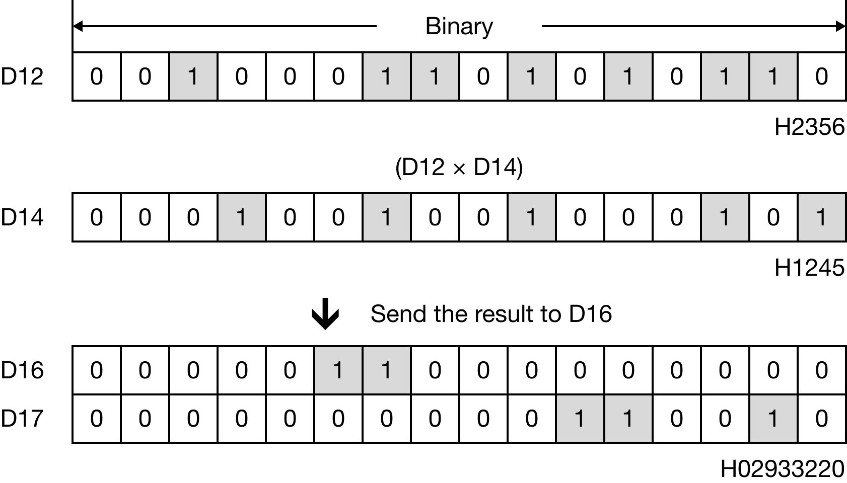 When M1.0 is powered ON, the 4-digit binary-coded decimal (BCD) data register, D12, is multiplied to the 4-digit binary-coded decimal (BCD) data register, D14, and the product is saved in the 8-digit binary-coded decimal data register, D16.
