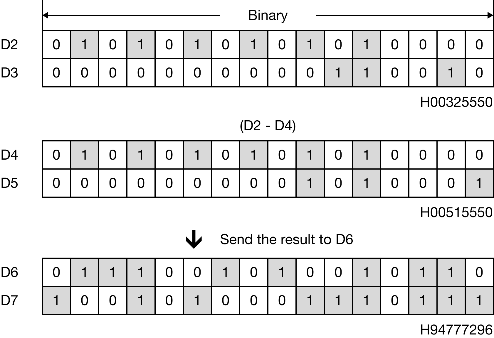 The DBSUB instruction subtracts an 8-digit binary-coded decimal (BCD) value, S2, from an 8-digit binary-coded decimal (BCD) value, S1, and saves the difference in an assigned 8-digit binary-coded decimal (BCD) data register, D.