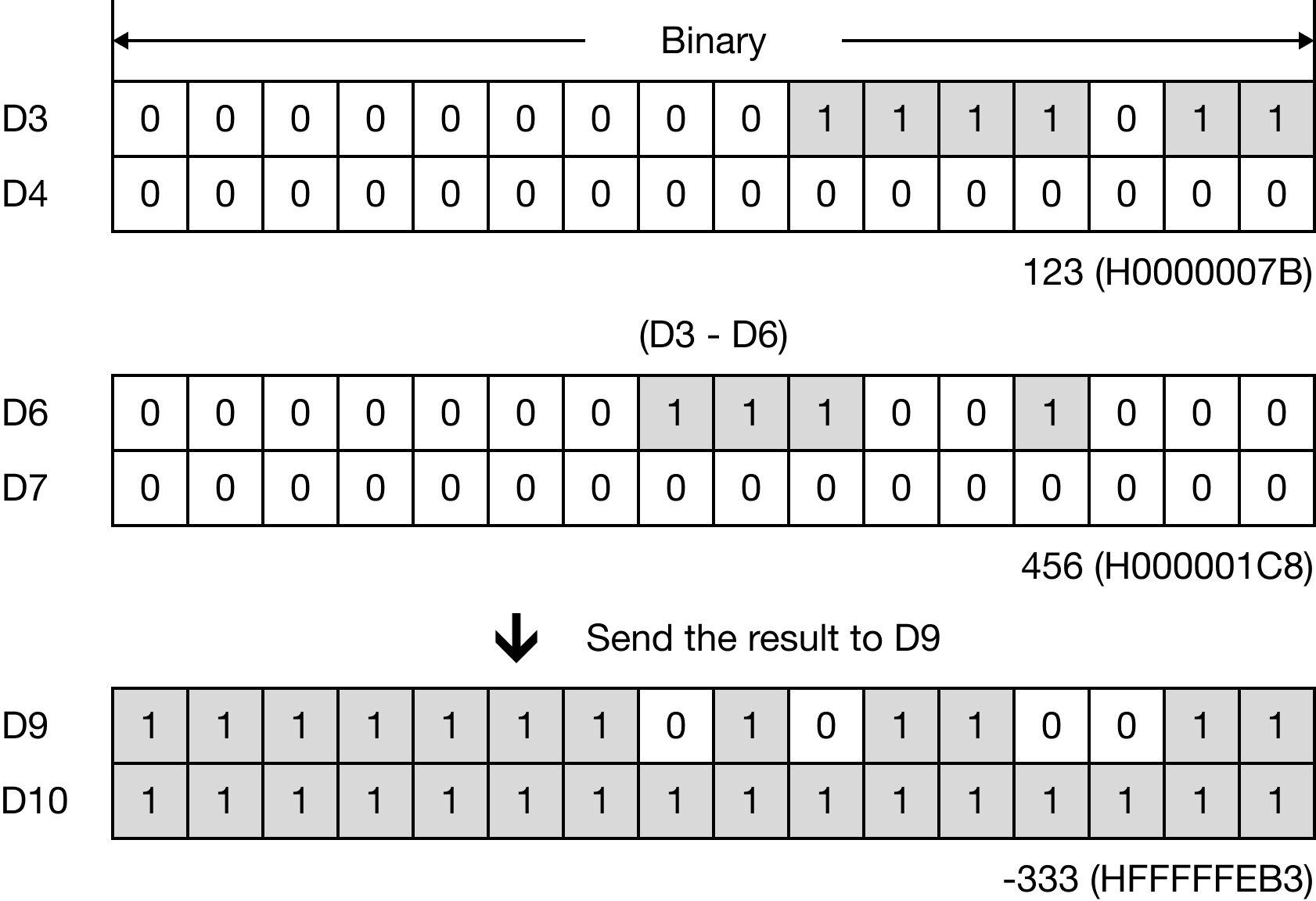 The DSUB instruction subtracts a DWORD value, S2, from a DWORD value, S1, and saves the difference in an assigned DWORD data register, D.