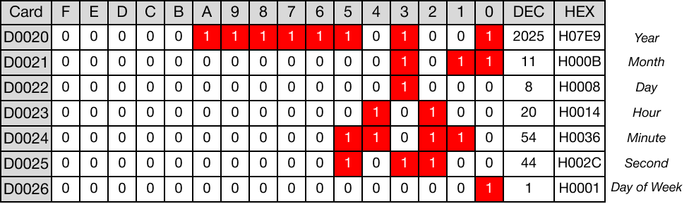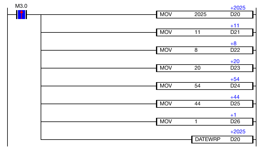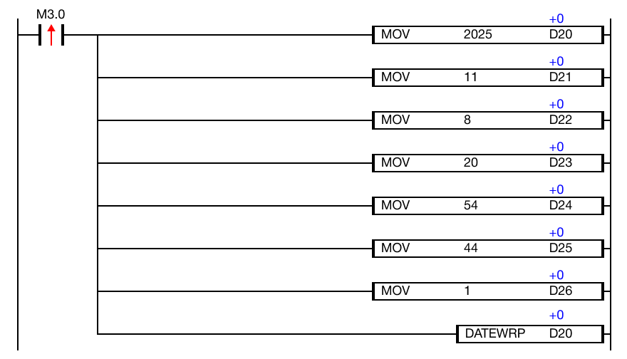 When the contact, M3.0, is powered ON (1), the instruction writes the block of time data, starting at the data register, D20, to the real time clock (RTC) device.
