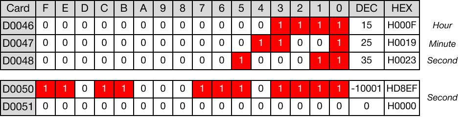 When the contact, M3.0, is powered ON (1), the time data data registers, D30, D31, and D32, are converted into DWORD second format.