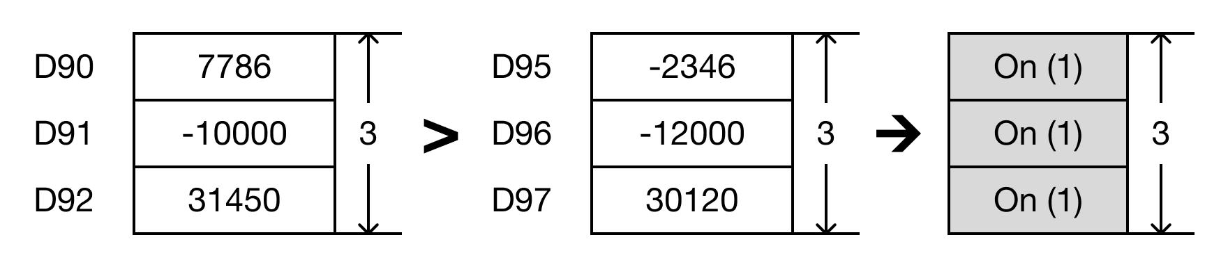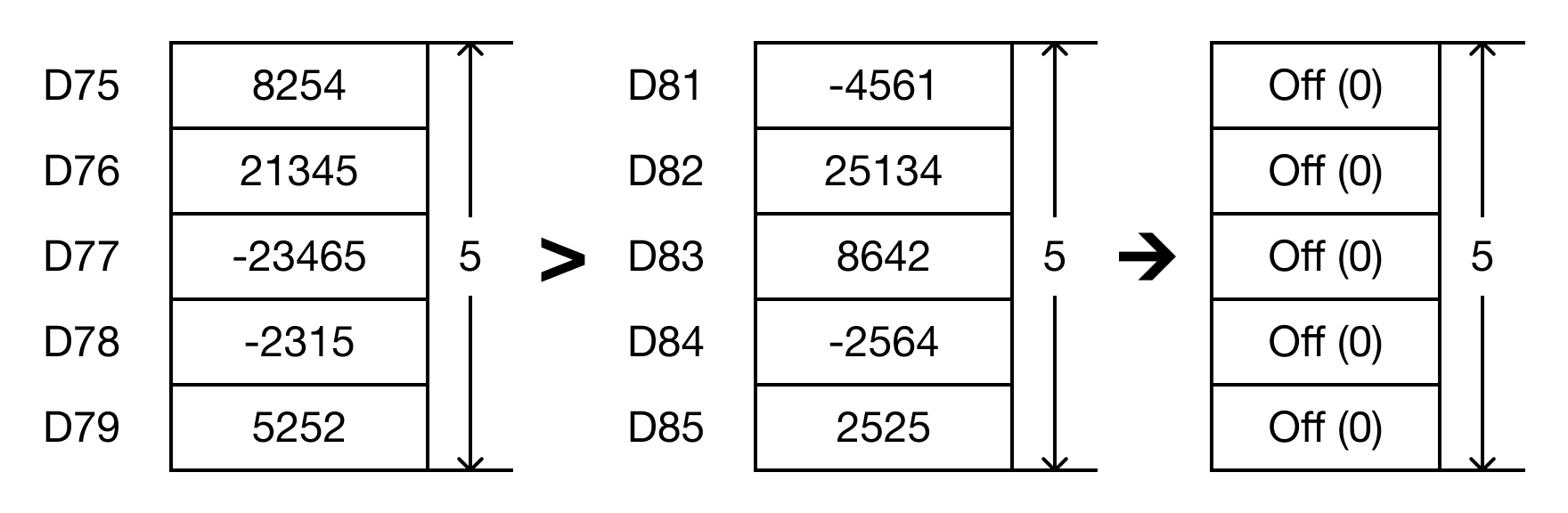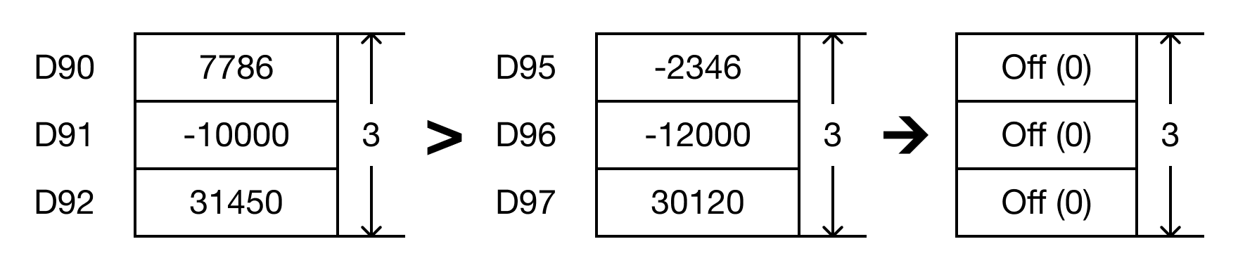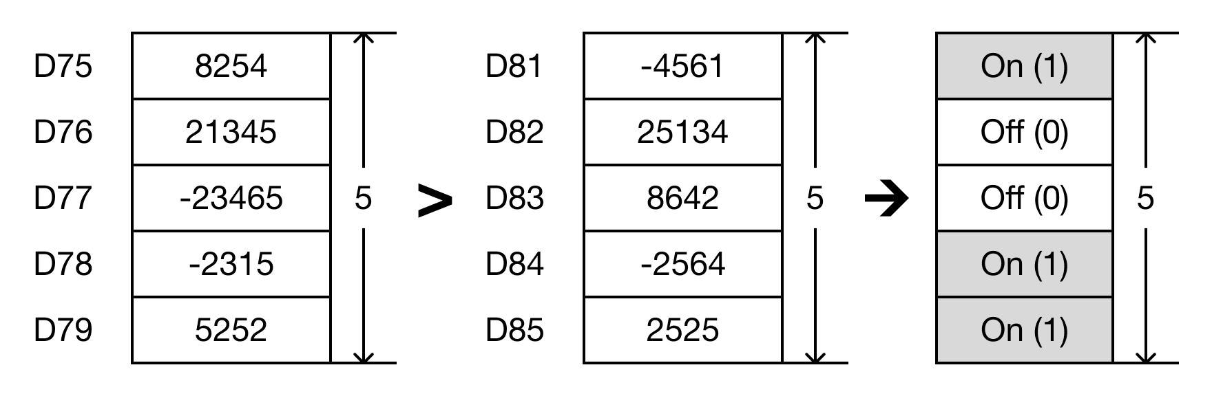 For each data register in the range S1 ~ Sn that is greater than each data register in the range S2 ~ Sn, the corresponding bit in the data register D, starting at bit number B, will turn ON (1).