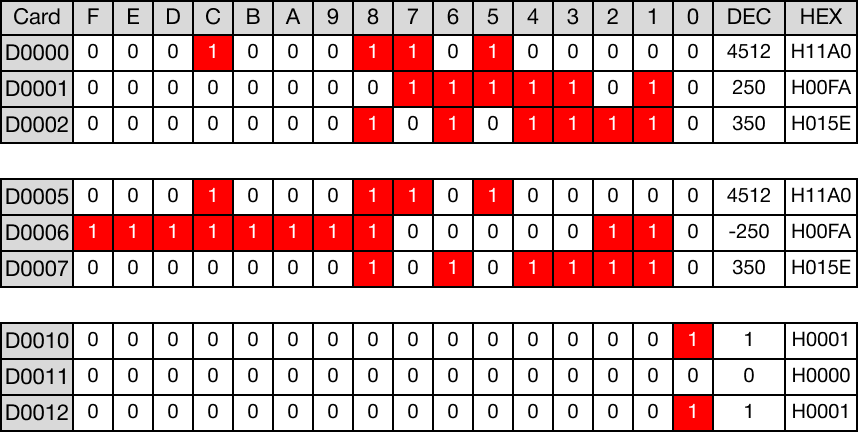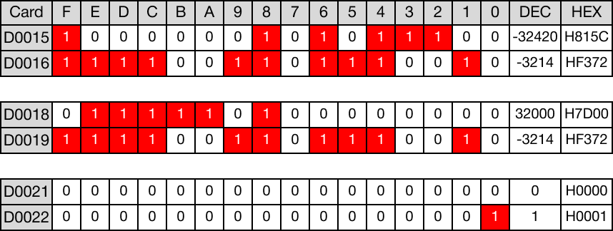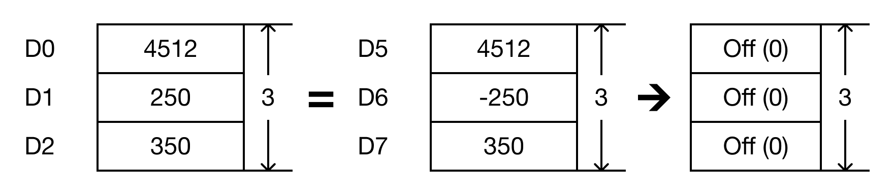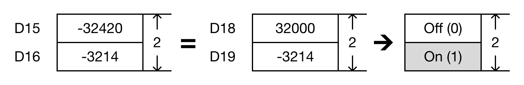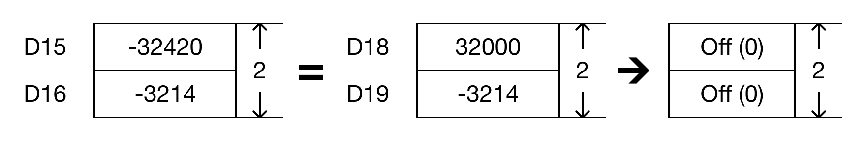 - When the open contact, M0.2, is powered ON (1), the values of the data registers are compared.