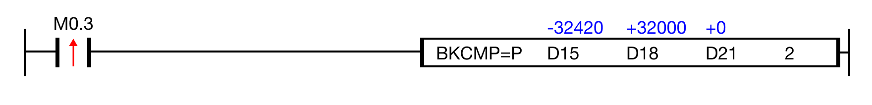 The BKCMP=P one-shot instruction compares n number of WORD data registers starting at S1 to n number of WORD data registers starting at S2.