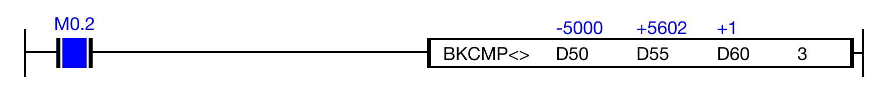 - When the open contact, M0.2, is powered ON (1), the values of the data registers are compared.