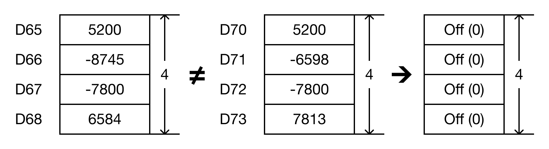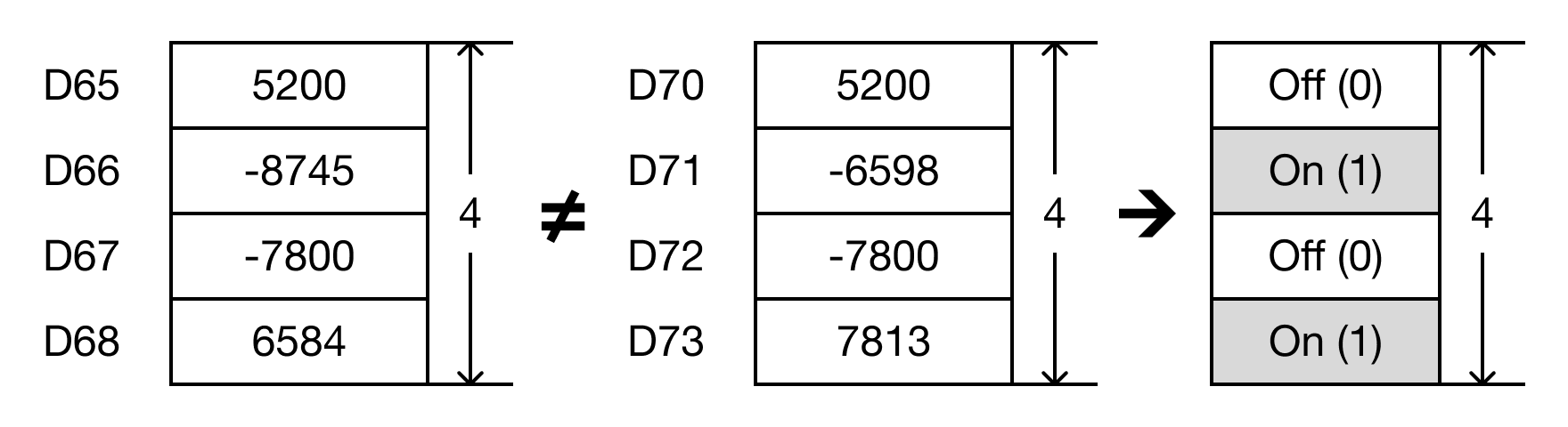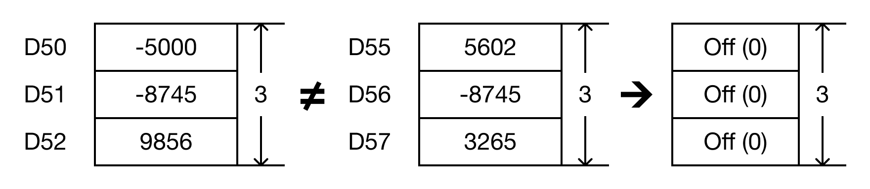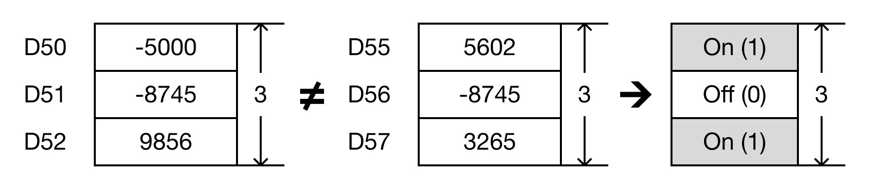 For each data register in the range S1 ~ Sn that is not equal to each data register in the range S2 ~ Sn, each data register in the range D ~ Dn will turn bit 0 to ON (1).