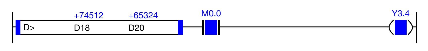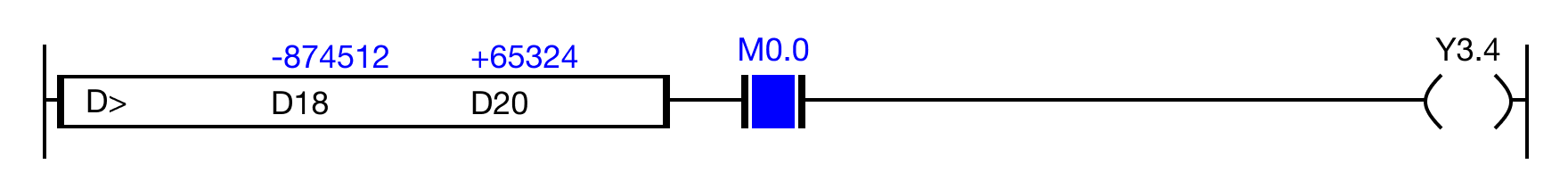 When the result of the instruction execution of the expression D18 > D20 (-874,512 > 65,324) is FALSE, and the contact, M0.0 is ON (1), the coil, Y3.4, is deenergized.