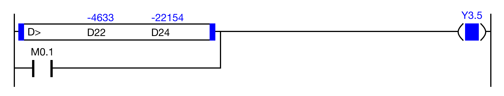 When the result of the instruction execution of the expression D10 > D12 (-463,320 > -22,154) is FALSE, or the contact, M0.1 is ON (1), the coil, Y3.5, is energized.