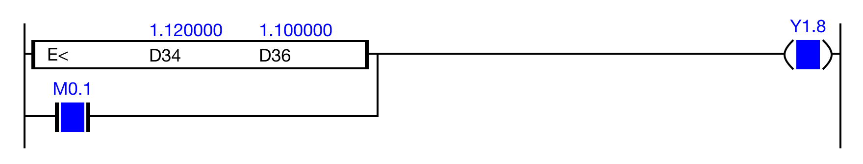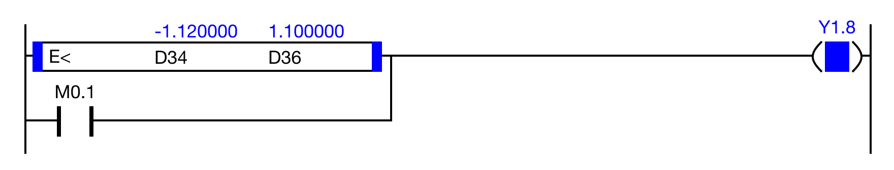When the result of the instruction execution of the expression D34 < D36 (1.120000 < 1.100000) is FALSE, or the contact, M0.1 is ON (1), the coil, Y1.8, is energized.