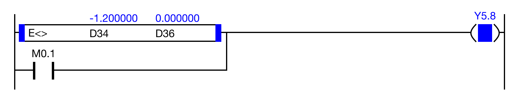 When the result of the instruction execution of the expression D34 ≠ D36 (2.400000 ≠ 2.400000) is FALSE, or the contact, M0.1 is ON (1), the coil, Y5.8, is energized.