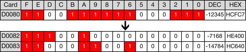 When the contact, M3.5, is powered ON (1), the value of the WORD data register, D80, -12,345, is converted into float notation.
