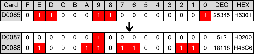 When the contact, M3.6, is powered ON (1), the value of the WORD data register, D85, 25,345, is converted into float notation.
