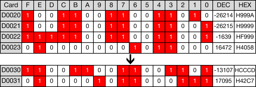 The value of the conversion, 99.900002, is saved in the REAL data register, D30.