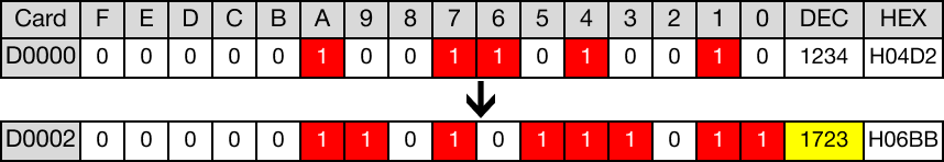 When the contact, M3.0, is powered ON (1), the value of the WORD data register, D0, 1,234, is converted into gray code notation.
