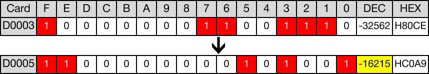 When the contact, M3.1, is powered ON (1), the value of the WORD data register, D3, -32,562, is converted into gray code notation.