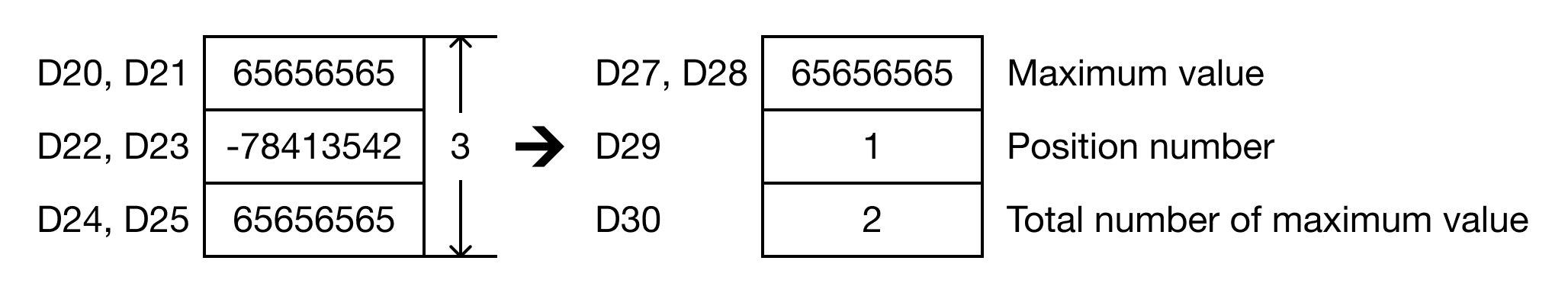 The DMAXP one-shot instruction searches n number of DWORD data registers, starting at S, for the maximum possible value. The result of the search is saved in 4 assigned WORD data registers starting at D.