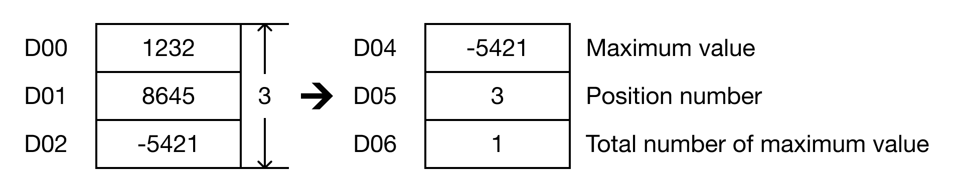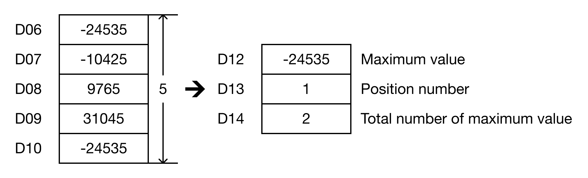 When the contact, M1.1 is ON (1), the instruction finds the minimum WORD value of 5 data registers, D6, D7, D8, D9, and D10.