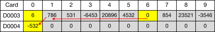 When the contact, M1.5, is powered ON (1), the FIFR instruction reads the first value in the TBL after the data register, D10 (D11).