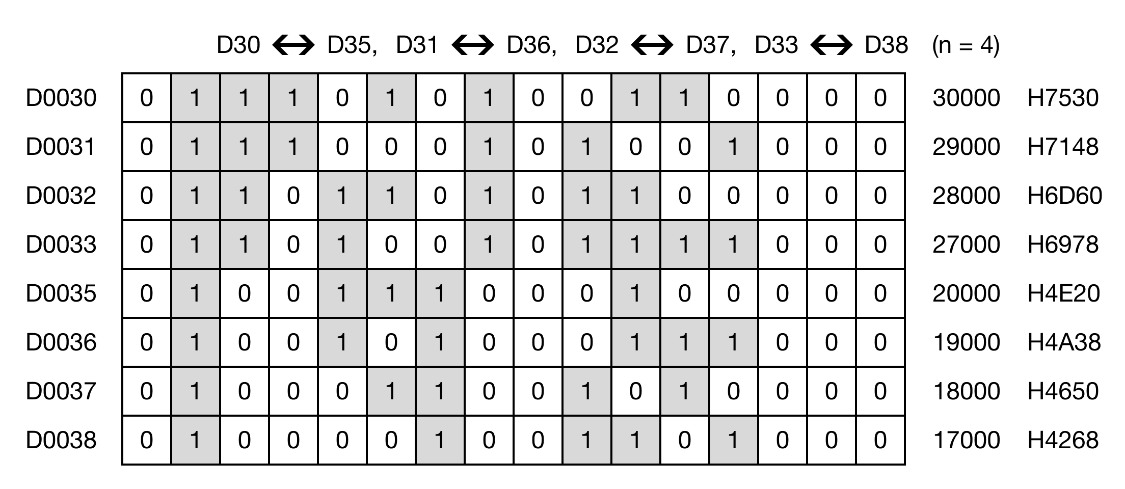When the contact, M0.1, is powered ON (1), the instruction exchanges the values of 4 data registers starting at D30 with 4 data registers starting at D35.