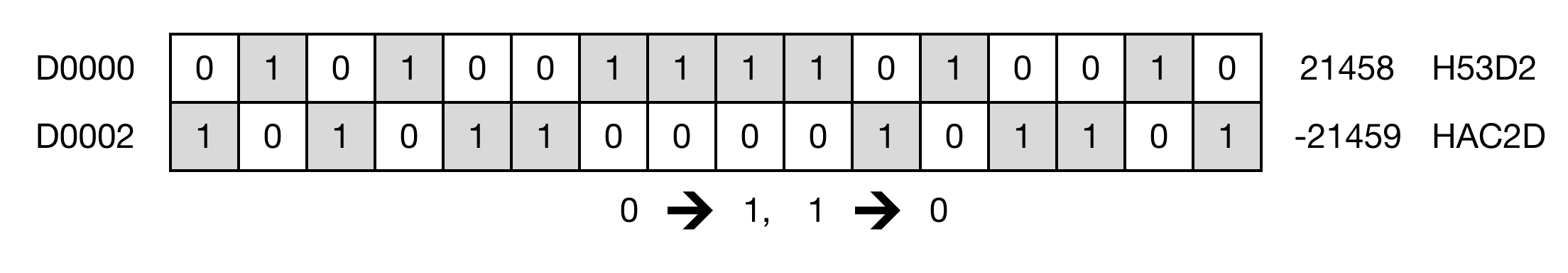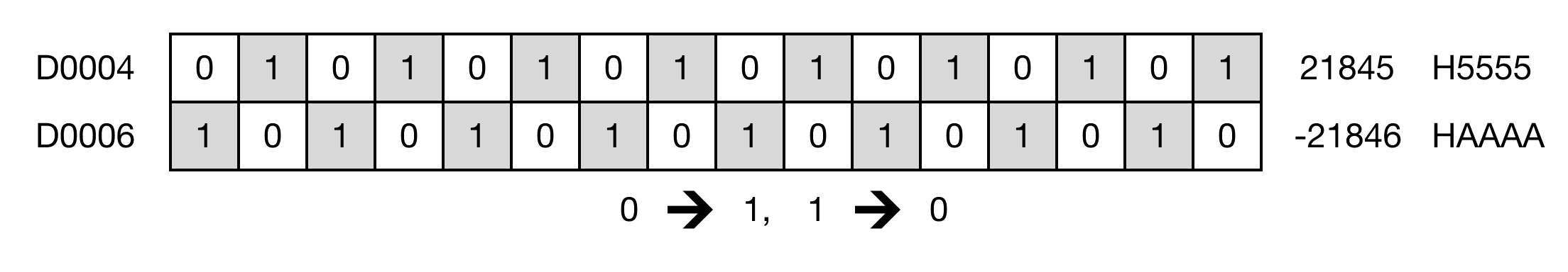 When the contact, M0.1, is powered ON (1), the instruction inverts the bits in the WORD data register, D4, and saves the result in the data register, D6.