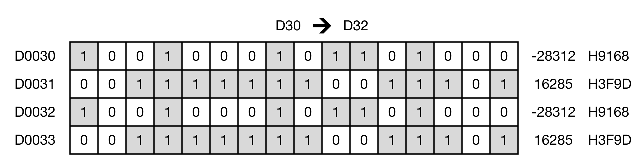 When the contact, M0.0, is powered ON (1), the instruction copies the value in the REAL data register, D30, into the data register, D32.
