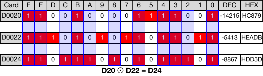 When the contact, M0.0, is powered ON (1), a logical XNOR operation is performed on the WORD data registers, D20 and D22.