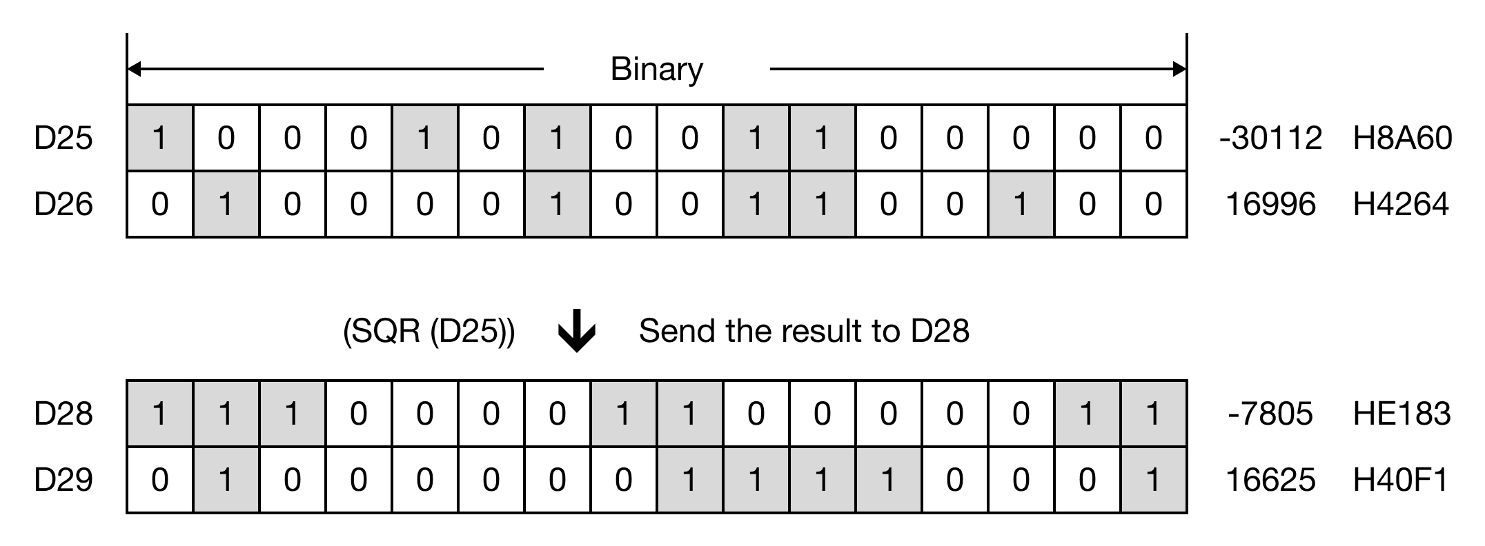 The SQR instruction calculates the square root of the REAL value, S, and saves the result in an assigned REAL data register, D.