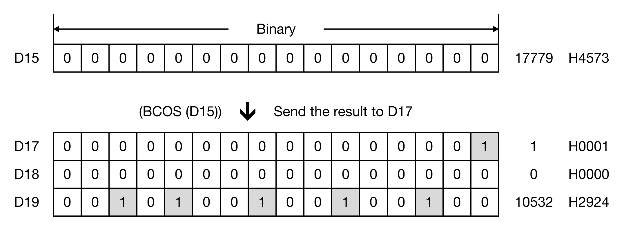 When the contact, M0.2, is ON (1), the instruction executes cos(H9245) and saves the result, H00000001.
