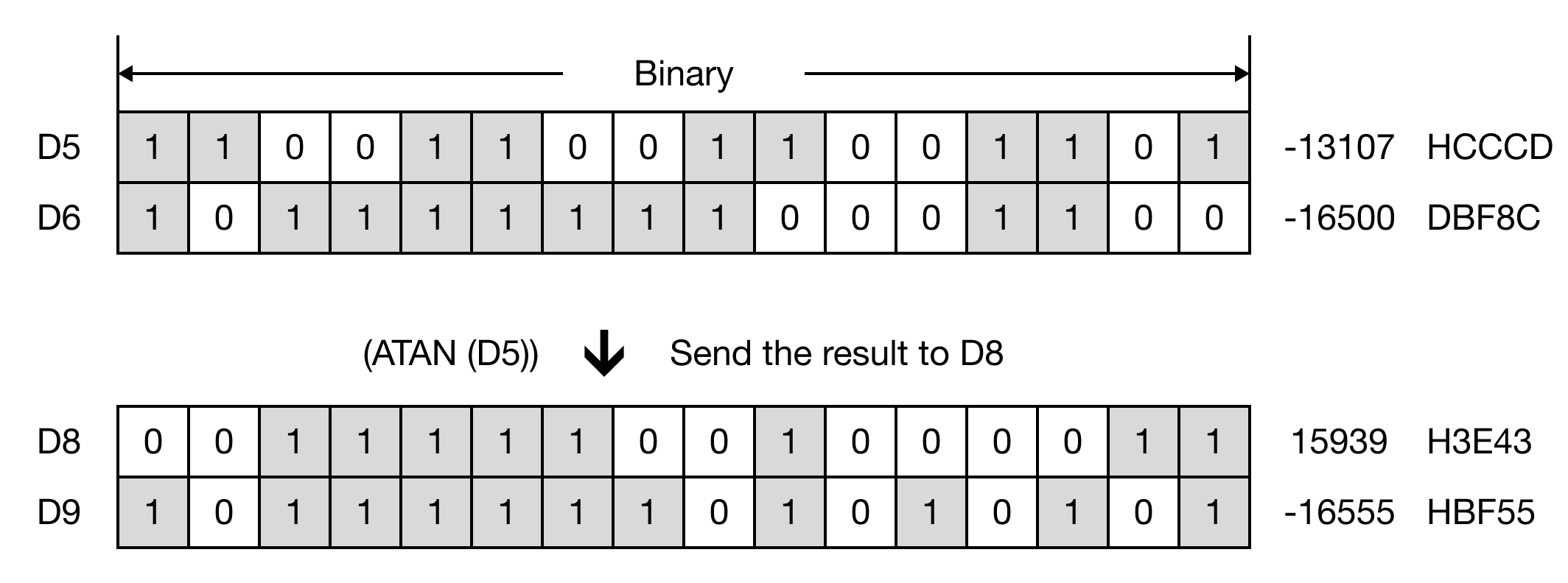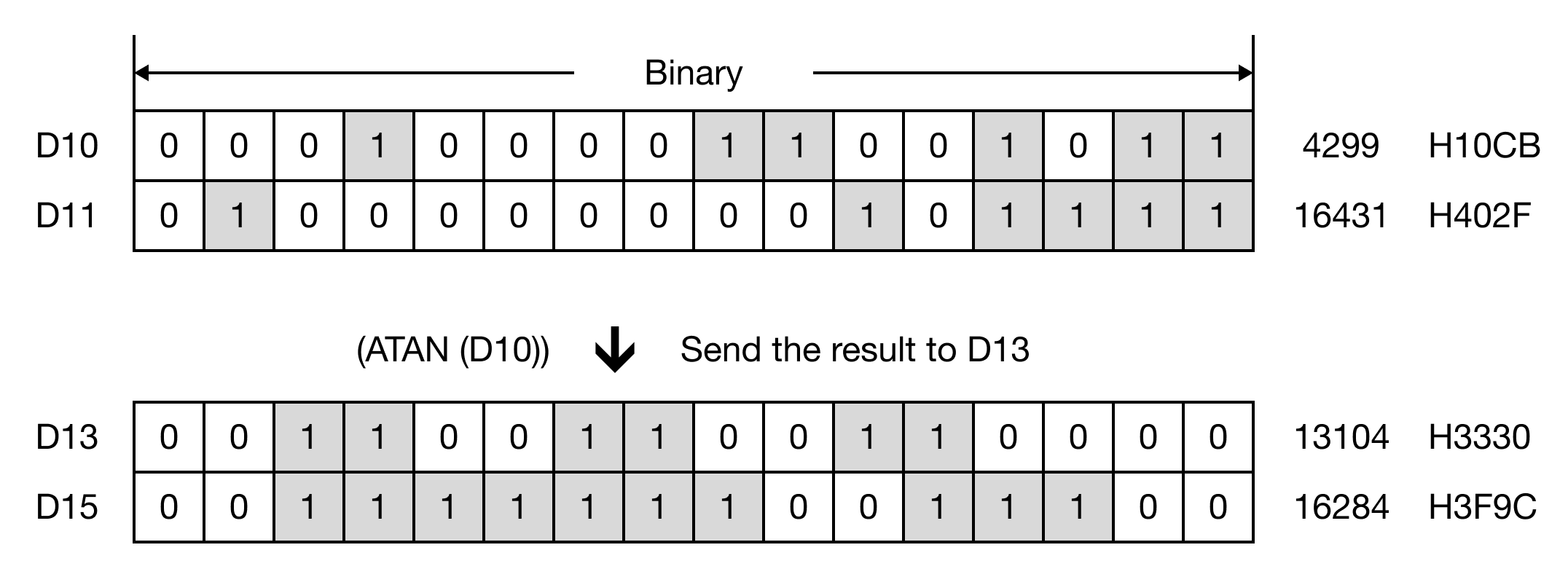 When the contact, M6.2, is ON (1), the instruction executes atan(-1.1) and saves the result, -0.832981.