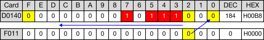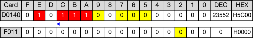 When the contact, M14.0, is powered ON (1), the WORD data register, D140, rotates 5 bits to the left.